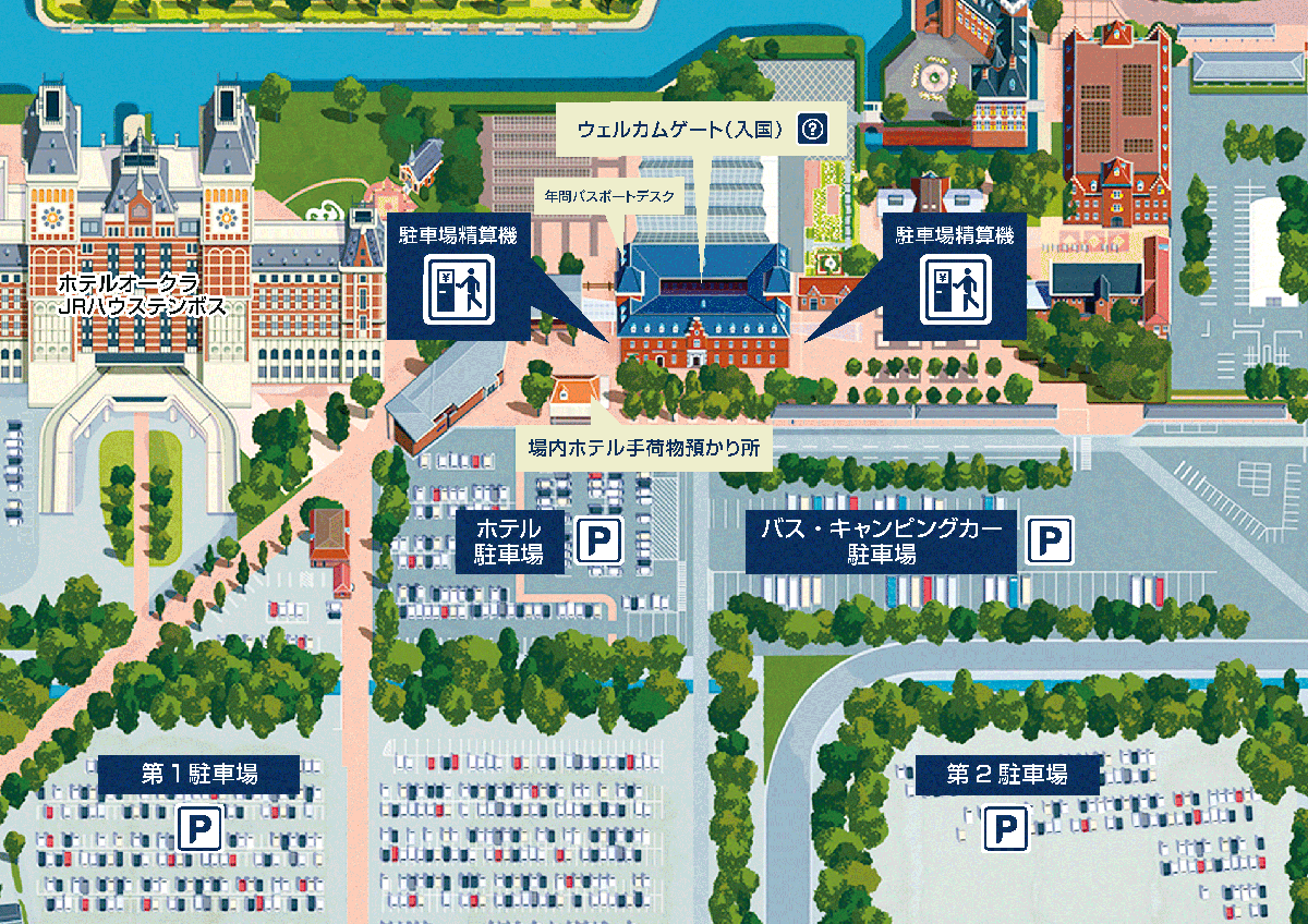 | 客人优先停车场 | 2,000日元/24小时 (场内酒店住宿者请向各酒店前台出示停车券。进行免费处理) ※4/27 (周一) 起 2,500日元/次 |