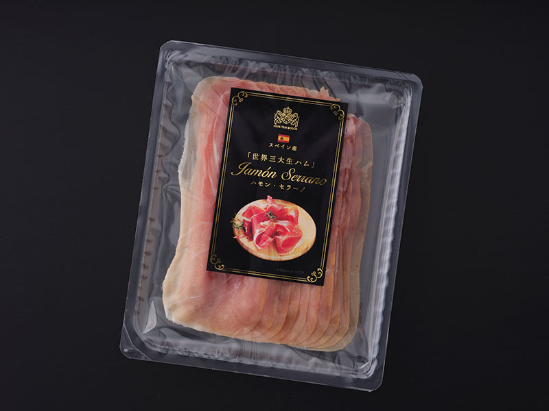世界三大生火腿之一,西班牙产的塞拉诺火腿。恰到好处的咸味和凝缩的美味是特点,下酒菜自不用说,沙拉也很合适。
