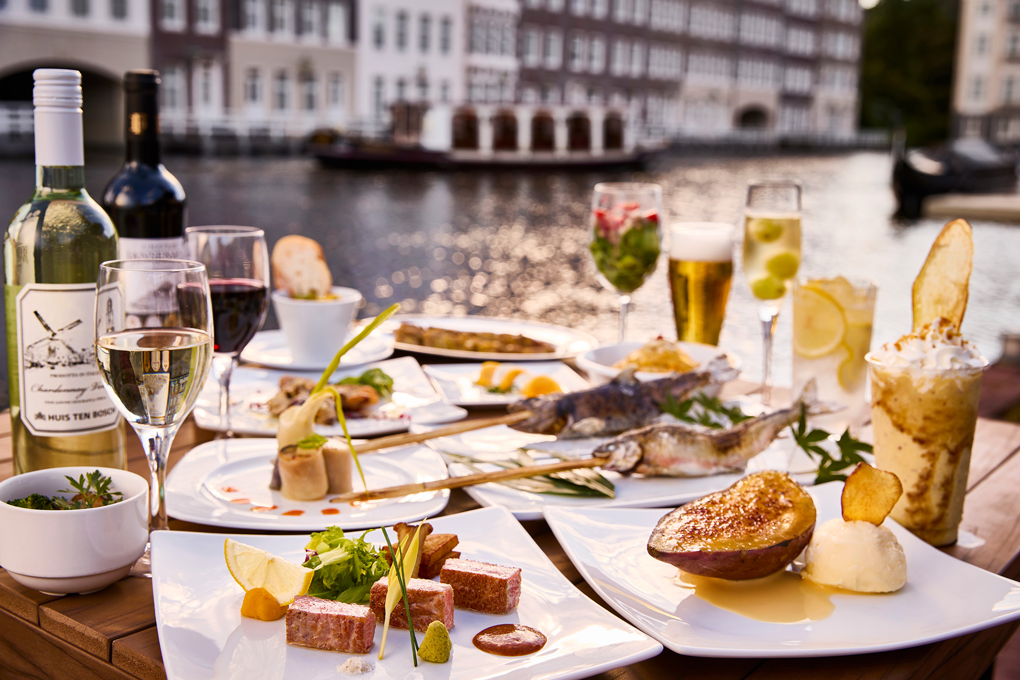 在风吹过的运河沿岸的露台席位,