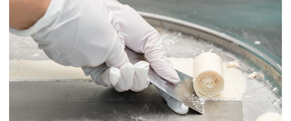 在冷却到零下10°C或更低的板上卷起冰淇淋的状态是一段有趣的时间,足以让你在电影中留下它。作为底料的冰淇淋和配菜的甜点、水果、酱汁也可以自由选择,所以可以制作出世界上独一无二的冰淇淋卷。