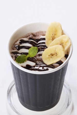 上面放着巧克力香蕉,与热可可完美搭配。(过敏/牛奶)