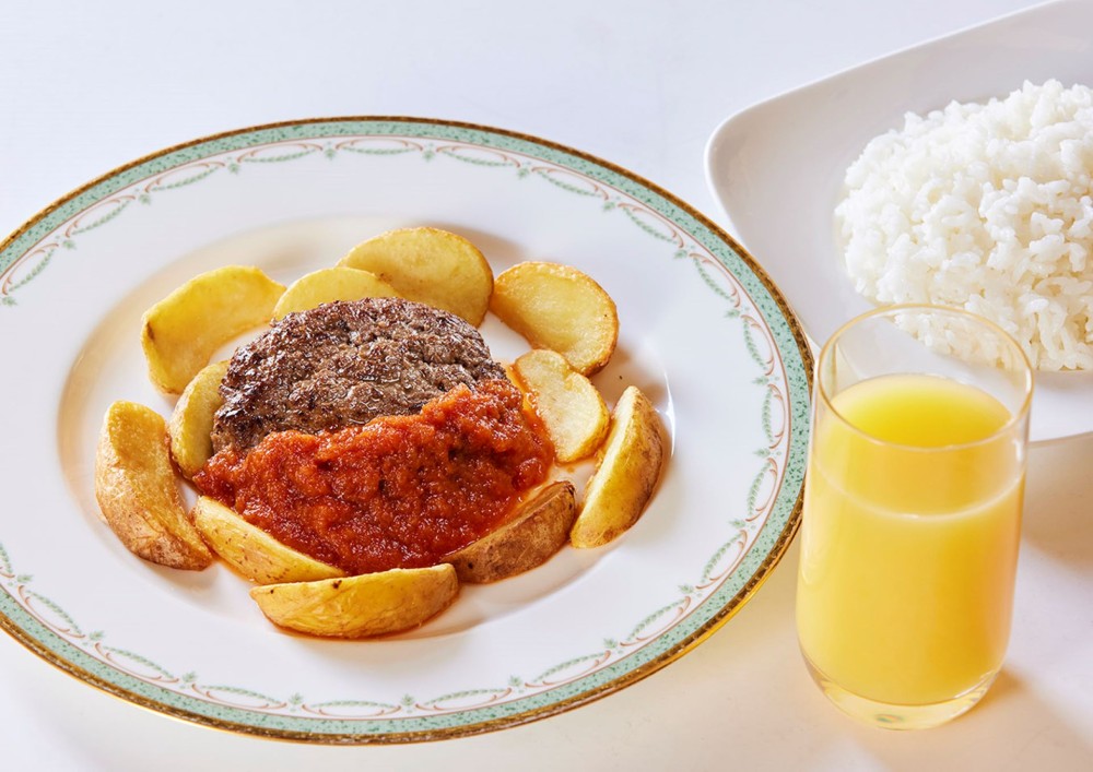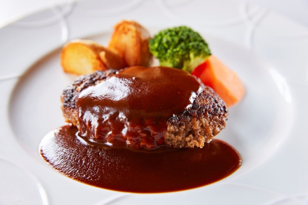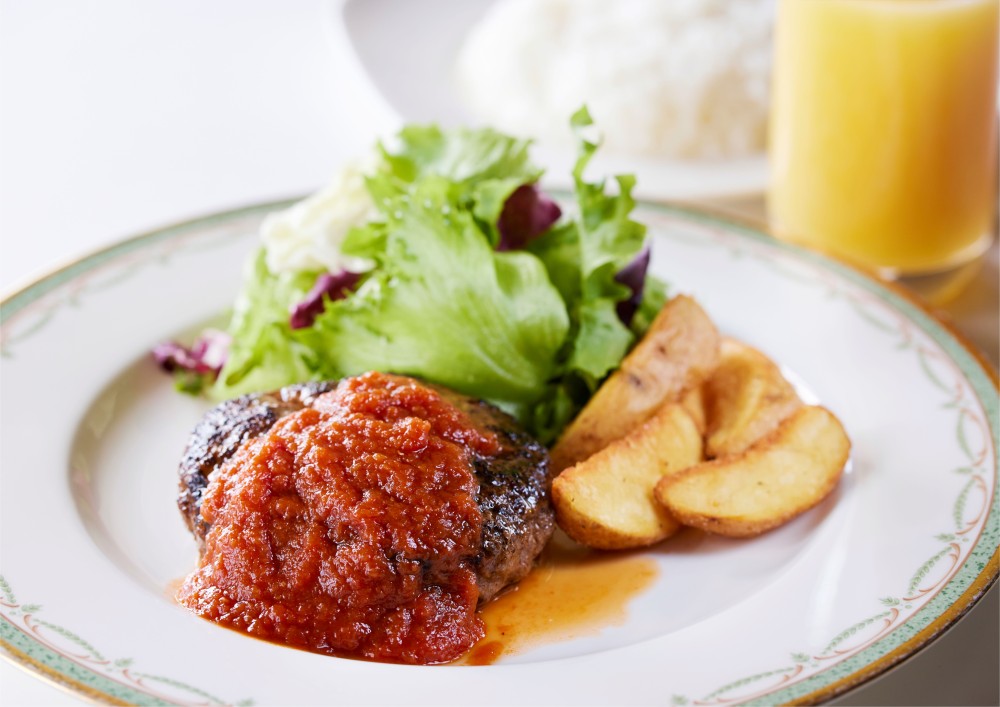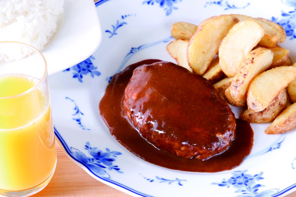 【ハンバーグ】牛ミンチ、玉ねぎ、塩、オリーブオイル、ケチャップ(トマト、砂糖、ブドウ糖加糖液、醸造酢、玉ねぎ、香辛料、にんにく)