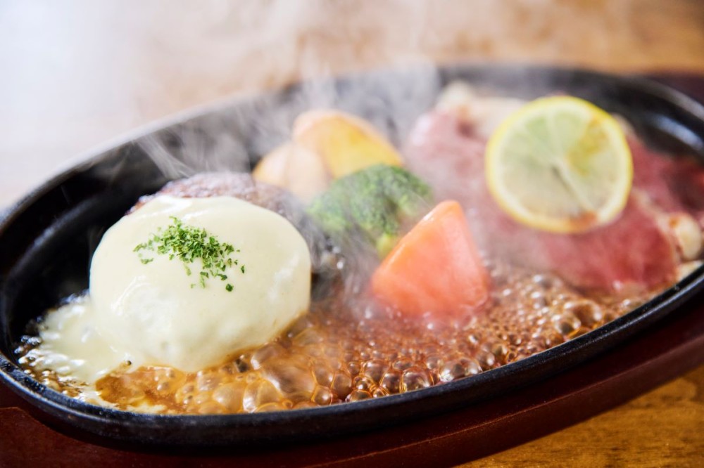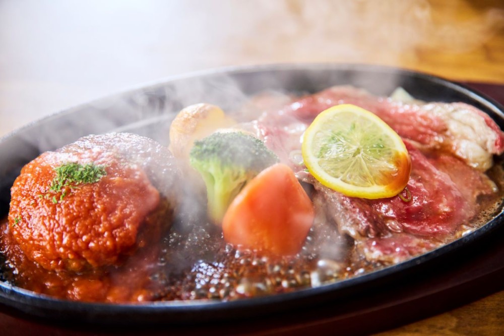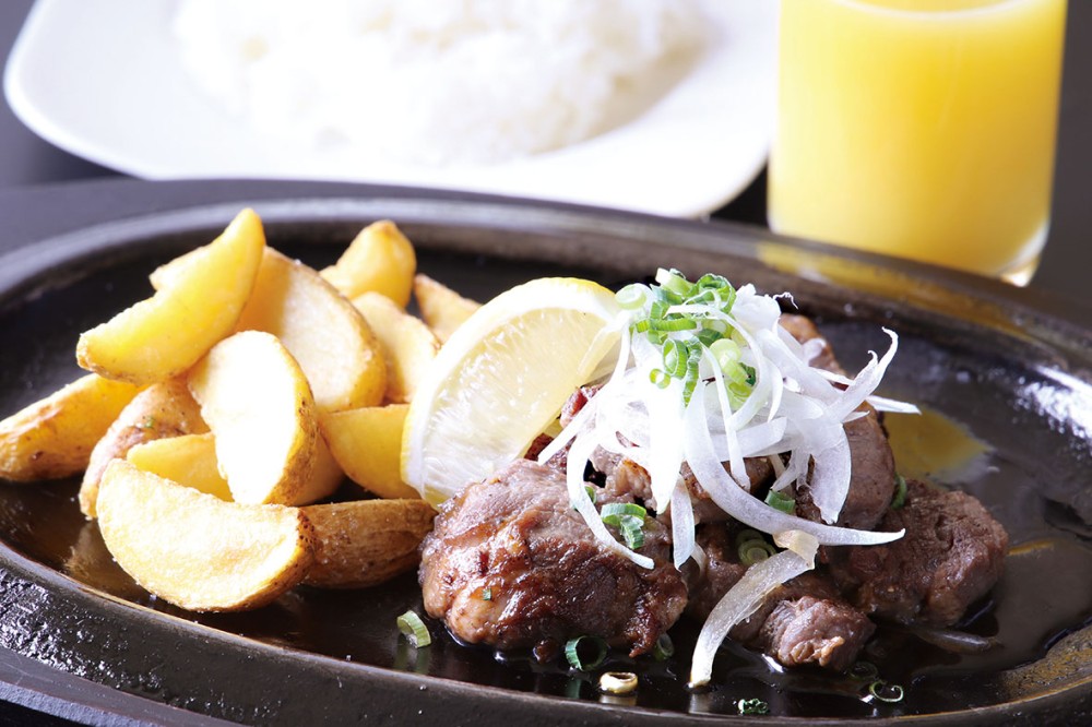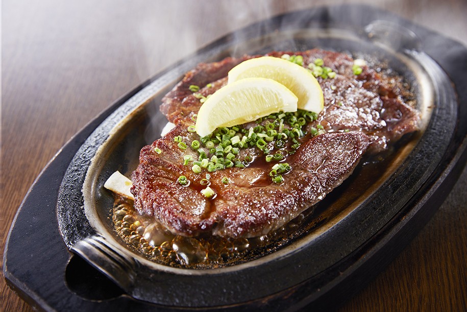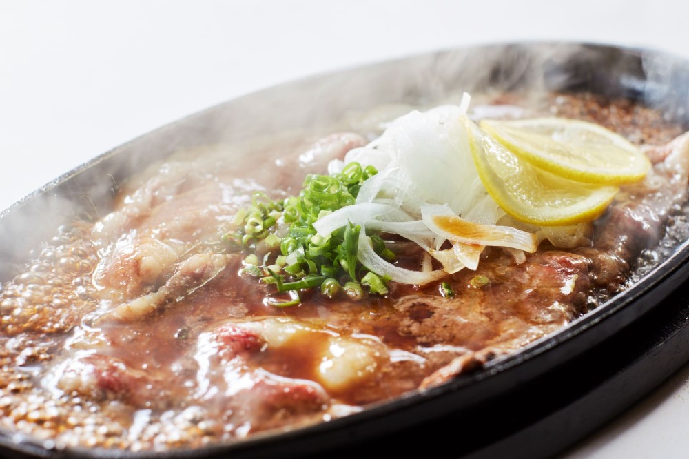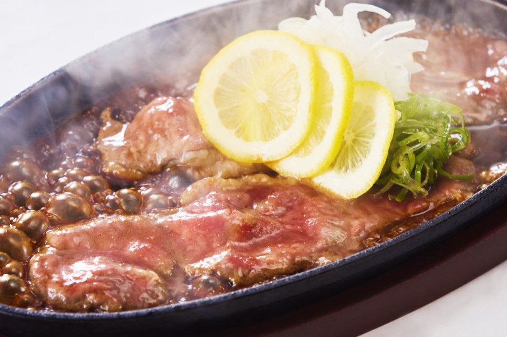 薄切りのステーキ肉を熱々の鉄板の上に置き、特製レモンソースで仕上げた一品。