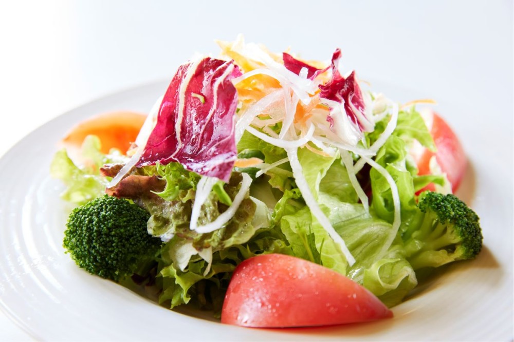 【サラダ、レモンドレッシング】野菜各種、酢(白ワインヴィネガー:アルコール・ぶどう)、レモン果汁、上白糖、塩、オリーブオイル
