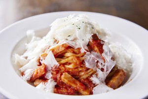 这是配有培科里诺罗马诺和厚切培根的特制番茄意大利面。