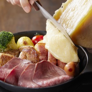 正宗瑞士拉可雷特芝士,浇满鸡肉、烤牛肉、大阿苏培根、蔬菜的浓厚热腾腾的绝品。※以加芝士的状态提供。