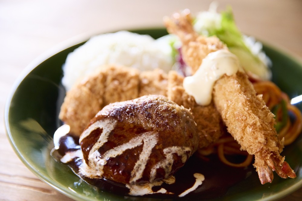 長崎生まれのトルコライスやハッシュドビーフのドリアなど、どこか懐かしい味わいのメニューが並ぶ洋食店。一番人気のミックストルコライスは、オムライス・ハンバーグ・クリームコロッケ・ナポリタンがワンプレートに。大満足のひと品です。