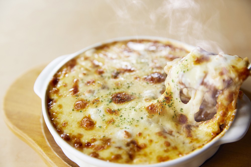 ハッシュドビーフと2種類のチーズをのせて焼き上げた定番のドリア。