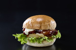 是双层蛋黄酱的红烧鸡肉汉堡。