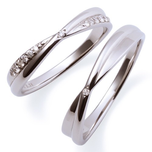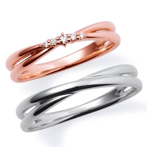 ふたつのラインが交差し、ふたりの出会いを表現した「クロッシング」シリーズのペアリング。中央には、”ふたりの愛情がずっと続きますように”との願いを込め、「永遠」の意味を持つダイヤモンドをセットしています。