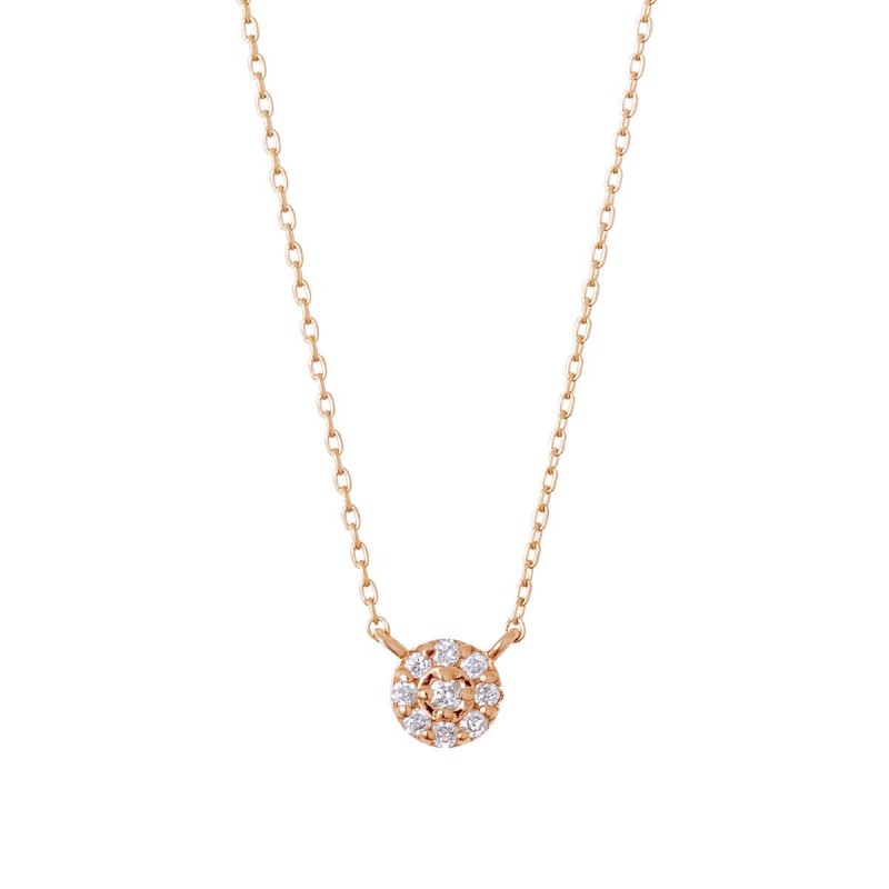 中央のダイヤモンドの周りを8石のメレダイヤモンドでふちどった、小ぶりながら存在感のあるネックレスです。