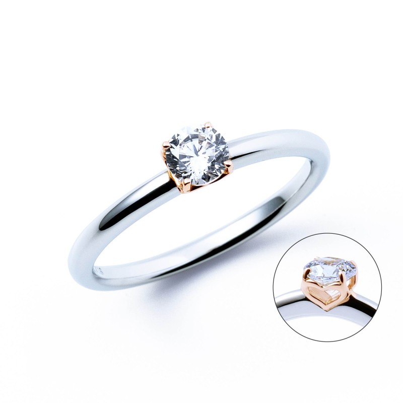 おふたりの「あたたかな愛情」をイメージして、ダイヤモンドの石座にさりげなくピンクゴールドのハートをデザインしました。